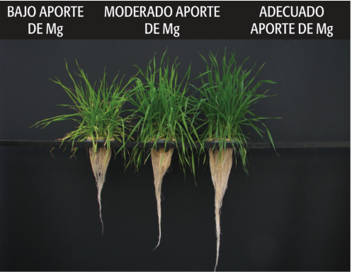 Fig. 1. Crecimiento de raíces y brotes de plantas de trigo con un suministro bajo, moderado y adecuado de magnesio. (Fuente: Cakmak, 2013, Plant and Soil).